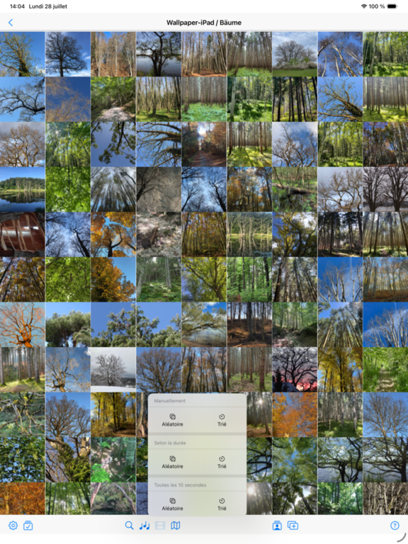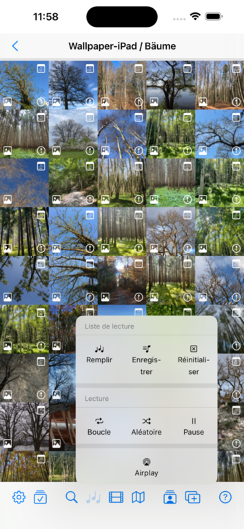 À l'aide de la fonction de recherche, les miniatures affichées peuvent être filtrées en fonction du répertoire et des noms de fichiers. Un diaporama automatique avec un intervalle de temps fixe ou individuel des photos et vidéos originales affichées (et filtrées) dans un ordre alphabétique ou aléatoire peut être démarré.